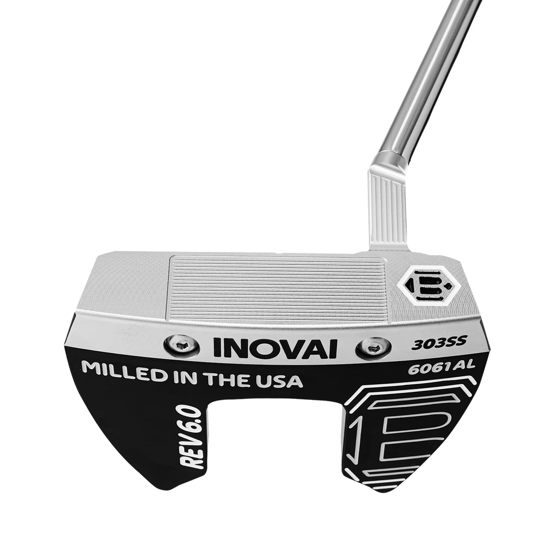 The newly re-engineered INOVAI 6.0 Spud was designed by Sam Bettinardi to perfect our most successful M.O.I. (Moment of Inertia) mallet to date. With two years of Tour feedback, Sam refined the 6.0 with a 5% smaller head from heel to toe, offering a sleek, more compact design than its predecessor. The 358 gram 6.0 features a precision-milled Roll Control face from 303 Stainless Steel and a 6061 Military Grade Aluminum body, with a new Stealth Black anodized finish. The slant neck offers a ¼ toe hang with a straight shaft, aimed at enhancing the natural flow of the putting arc for maximum forgiveness throughout the stroke. The INOVAI 6.0 has consistently been in play by multiple Bettinardi staffers on Tour since its initial release in 2020.