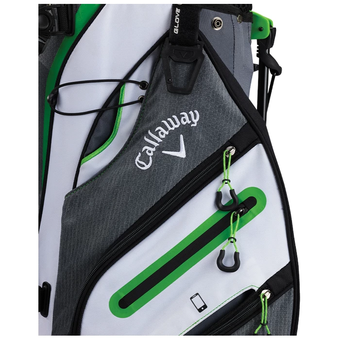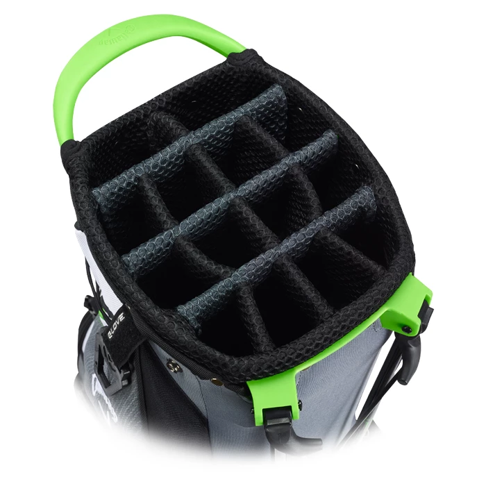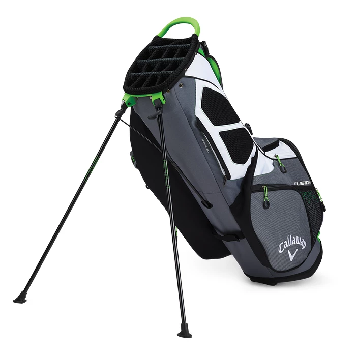 The Fusion 14 fuses the best of storage and a 14-way top of a cart bag in a light weight stand bag. It features 12 well thought out pockets, including a magnetic valuables and water bottle pocket, a quick access cell phone sleeve and quick release straps so you can remove them and keep them out of the way when on a cart or trolley.
