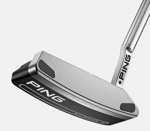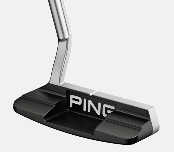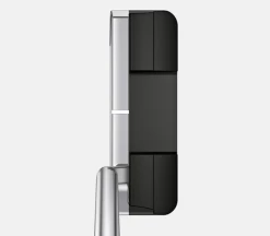 Tungsten toe and heel weights provide stability and forgiveness for improved accuracy, and the shallow milled face delivers a firmer feel, crisp sound and consistent ball speed. The platinum topline (and short alignment line) contrasts against a black, ball-width cavity floor that frames the ball.